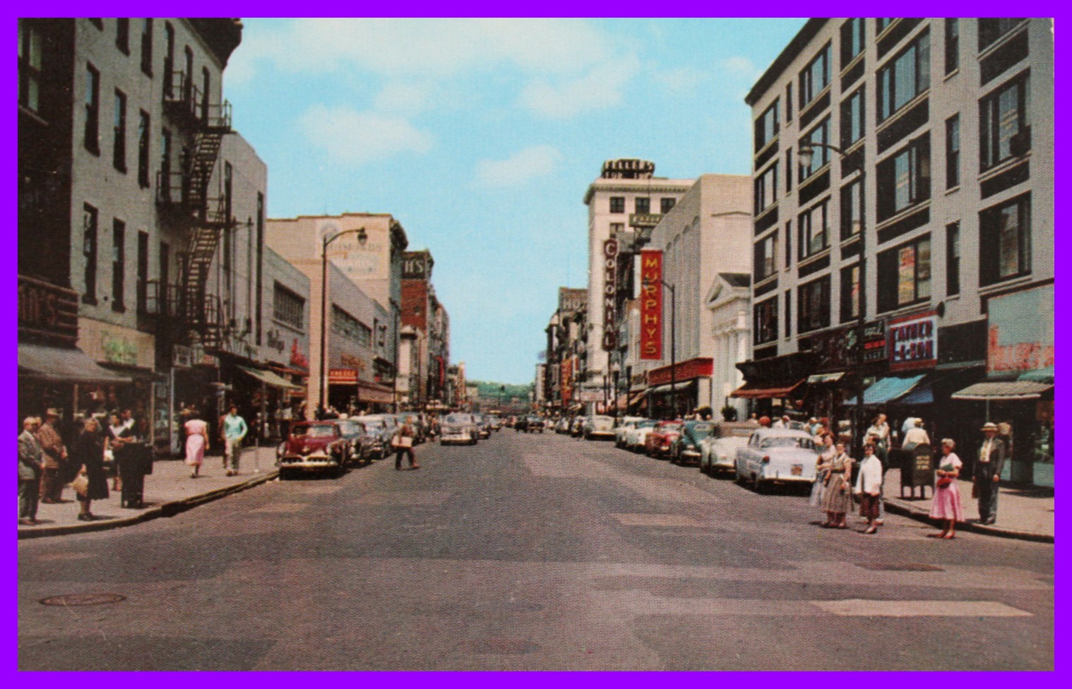 An undated color photo post card view of commercial activity on Market Street, Harrisburg, Dauphin County, Pennsylvania.