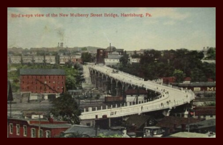 A 1909 colorized post card birds-eye view of the new Mulberry Street Bridge, Harrisburg, Dauphin County, Pennsylvania.