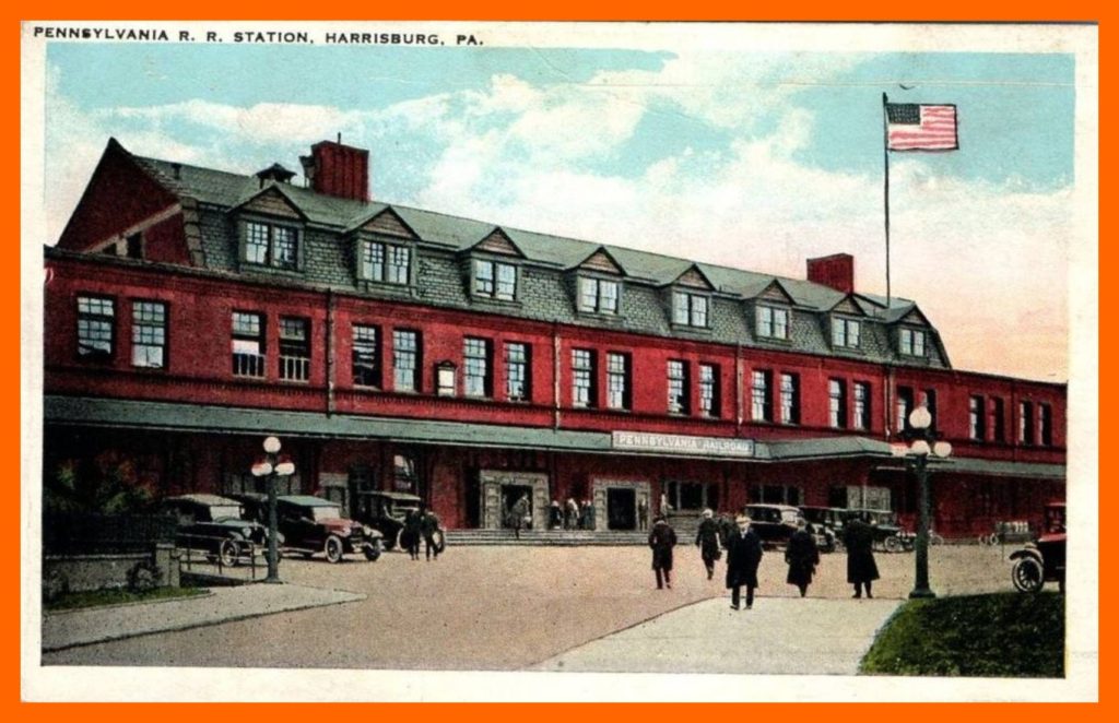 An undated colorized post card view of the Pennsylvania Railroad Station at Harrisburg, Dauphin County, Pennsylvania.