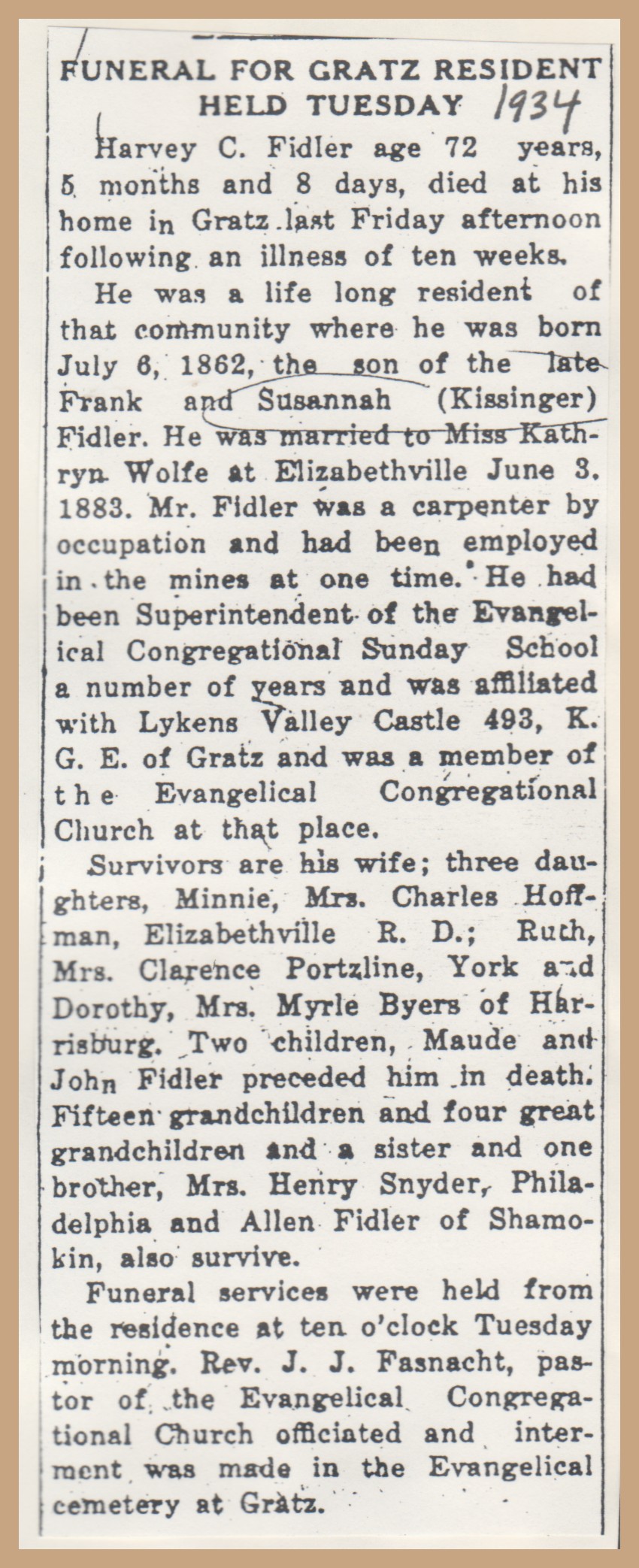 He was a life long resident of that community where he was born July 6, 1862, the son of the late Frank Fidler and Susannah [Kissinger] Fidler. He was married to Miss Kathryn Wolfe at Elizabethville, June 3, 1883. Mr. Fidler was a carpenter by occupation and had been employed in the mines at one time. He had been Superintendent of the Evangelical Congregational Sunday School a number of years and was affiliated with Lykens Valley Castle 493, K. G. E. [Knights of the Golden Eagle] of Gratz and was a member of the Evangelical Congregational Church at that place.