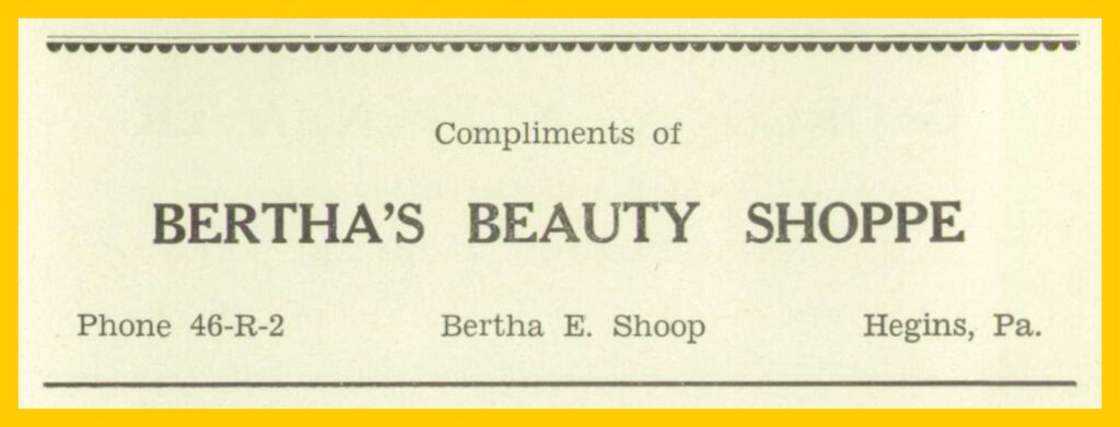 A 1952 advertisement for Bertha’s Beauty Shoppe, Hegins, Schuylkill County, Pennsylvania.