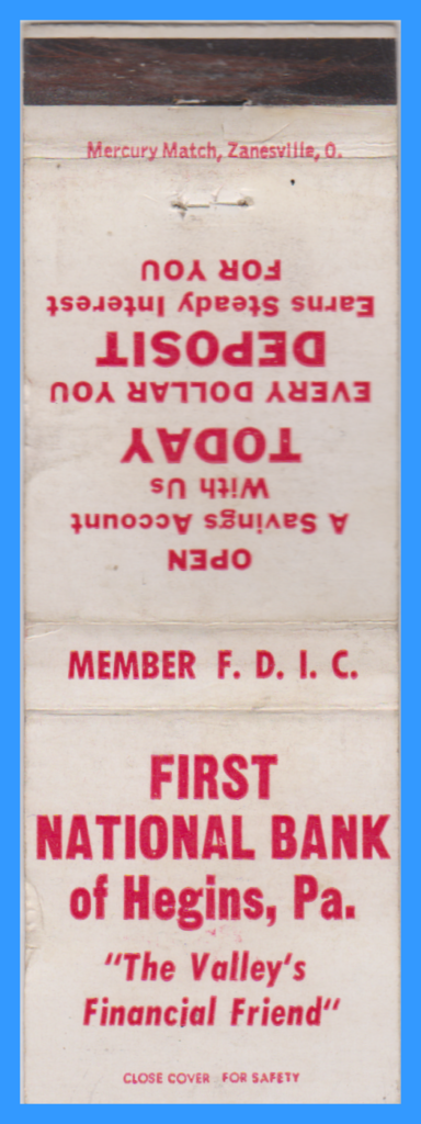 An undated match book cover advertisement for the First National Bank of Hegins, Schuylkill County, Pennsylvania.