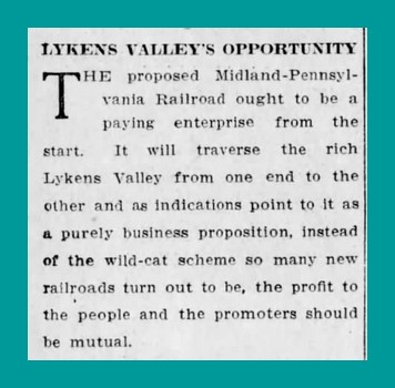 The proposed Midland Pennsylvania Railroad ought to be a paying enterprise from the start. It will traverse the rich Lykens Valley from one end to the other and as indications point to it as a purely business proposition, instead of the wild-cat scheme so many new railroads turn out to be, the profit to the people and the promoters should be mutual.