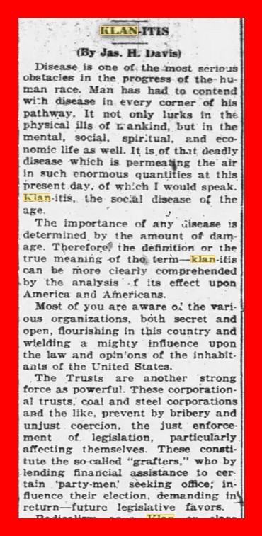 Disease is one of the most serious obstacles in the progress of the human race. Man has had to contend with disease in every corner of his pathway. It not only lurks in the physical ills of mankind, but in the mental, social, spiritual, and economic life as well. It is of that deadly disease which is permeating the air in such enormous quantities at this present day, of which I would speak, Klan-itis, the social disease of the age,