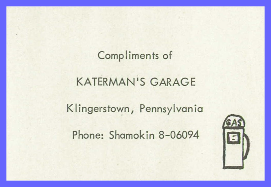 A 1954 advertisement for Katerman’s Garage, Klingerstown, Schuylkill County, Pennsylvania.