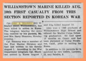 WILLIAMSTOWN MARINE KILLED AUG. 10th FIRST CASUALTY FROM THIS SECTION REPORTED IN KOREAN WAR Cpl. John A. Shammo, 313 W. Market Street, Williamstown, has been killed in action in Korea. … Continue reading Korean Conflict – John A. Shammo – Killed in Action, 1950