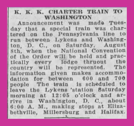 A brief article from the Lykens Standard, July 24, 1925, indicating that the Ku Klux Klan had chartered a train to depart from Lykens, Dauphin County, Pennsylvania, on August 8, 1925, and arrive in Washington, D. C. for the National Convention of the Klan.