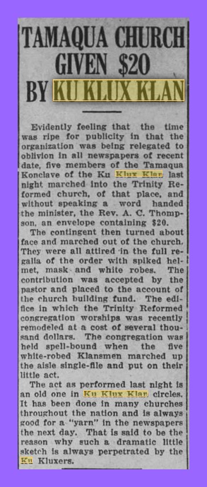 Evidently feeling that the time was ripe for publicity in that the organization was being relegated to oblivion in all newspapers of recent date, five members of the Tamaqua Konclave of the Ku Klux Klan last night marched into the Trinity Reformed Church of that place, and without speaking a word, handed the minister, Rev. A. C. Thompson an envelope containing $20.