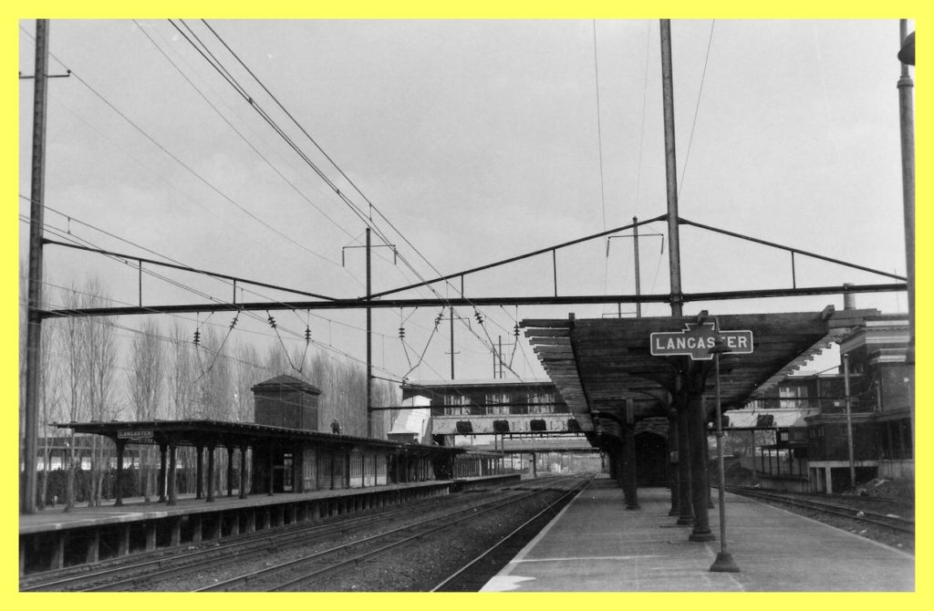 An undated photograph of the track and platform side of the Pennsylvania Railroad Station at Lancaster, Lancaster County, Pennsylvania.