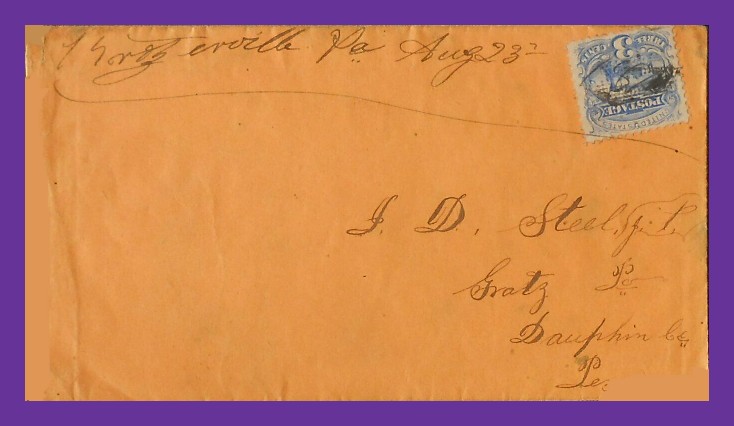 An envelope or cover addressed to I. D. Steel, Gratz, Dauphin County, Pennsylvania. The sender is unknown as is the place of origin (—– ville?, Pennsylvania), but from the pen date at the top it is assumed that it was mailed on August 23, possibly in 1870. In 1870, there was no home delivery in Gratz, so I. D. Steel has to go to the Gratz Post Office to receive his/her mail.