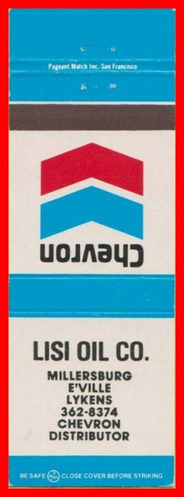 An undated advertising matchbook cover for Lisi Oil Company of Millersburg, Elizabethville, and Lykens, Dauphin County, Pennsylvania.