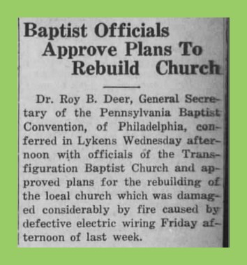 Dr. Roy B. Deer, General Secretary of the Pennsylvania Baptist Convention, of Philadelphia, conferred in Lykens Wednesday afternoon with officials of the Transfiguration Baptist Church and approved plans for the rebuilding of the local church which was damaged considerably by fire caused by defective electric wiring Friday afternoon of last week.