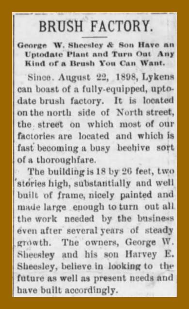 In 1898, one of the most promising industries in the development of the Lykens Valley was begun in Lykens Borough, Dauphin County, Pennsylvania, by George W. Sheesley and his son, Harvey E. Sheesley. It was a brush factory on North Street in Lykens, Dauphin County, Pennsylvania.