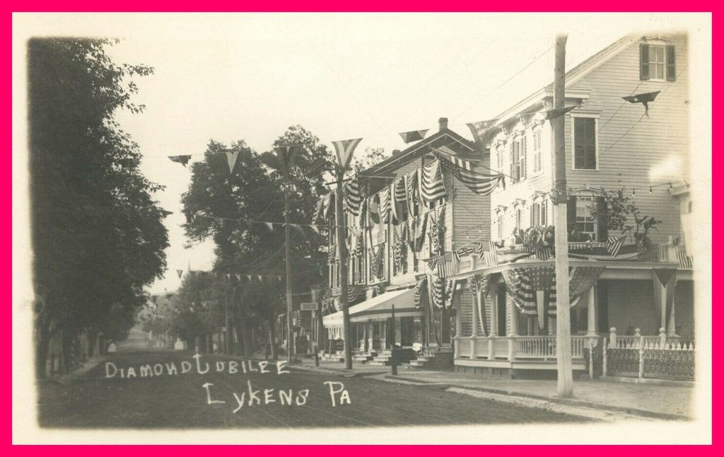 A 1913 photo post card showing a row of houses in Lykens, Dauphin County, Pennsylvania, decorated for the Diamond Jubilee.