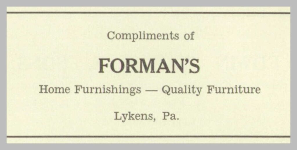 A 1952 advertisement for Forman’s, Lykens, Dauphin County, Pennsylvania.