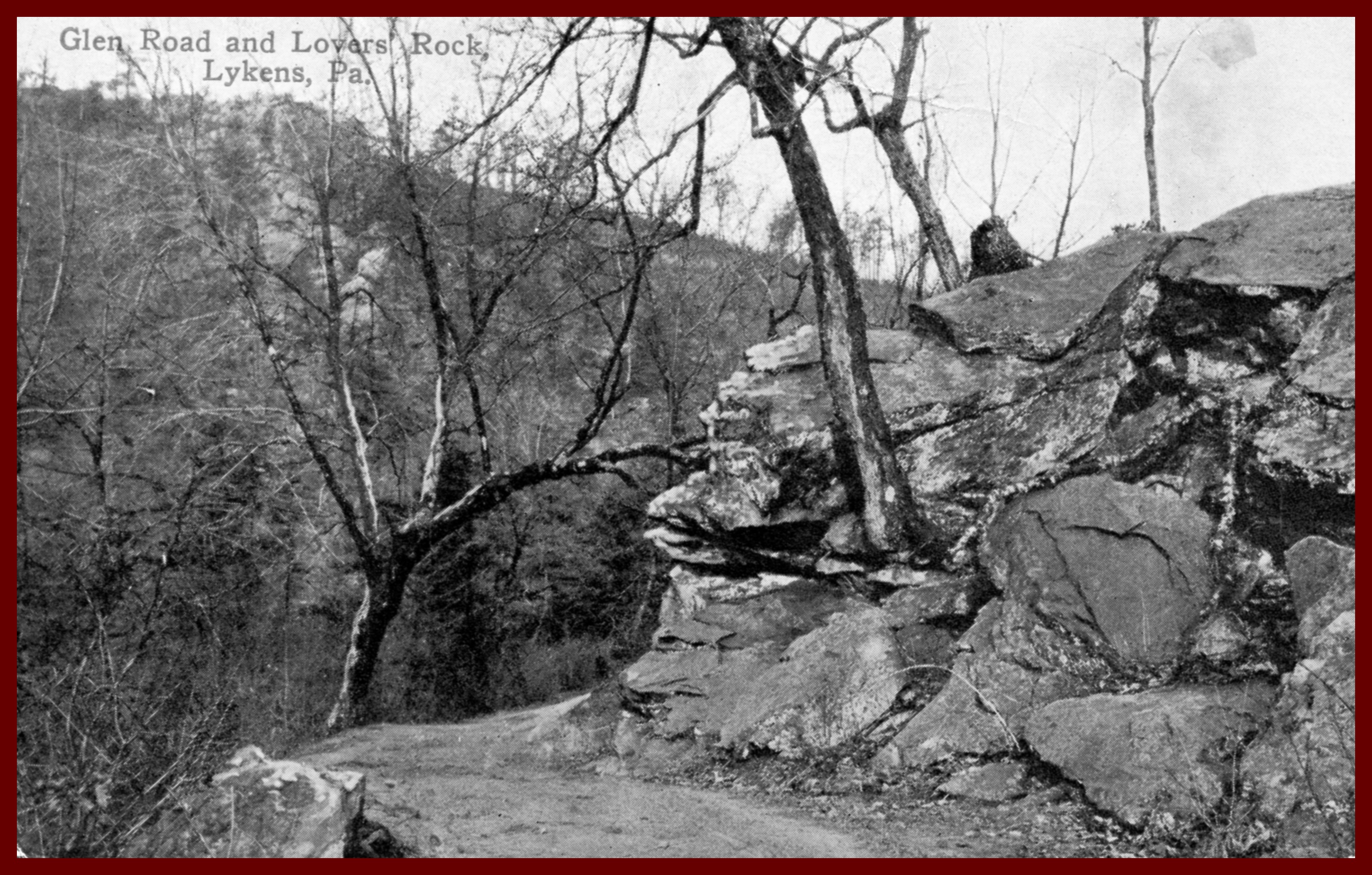 An undated post card view of the Glen Road and Lovers’ Rock, Lykens, Dauphin County, Pennsylvania. This attraction was located south of the main part of the borough.
