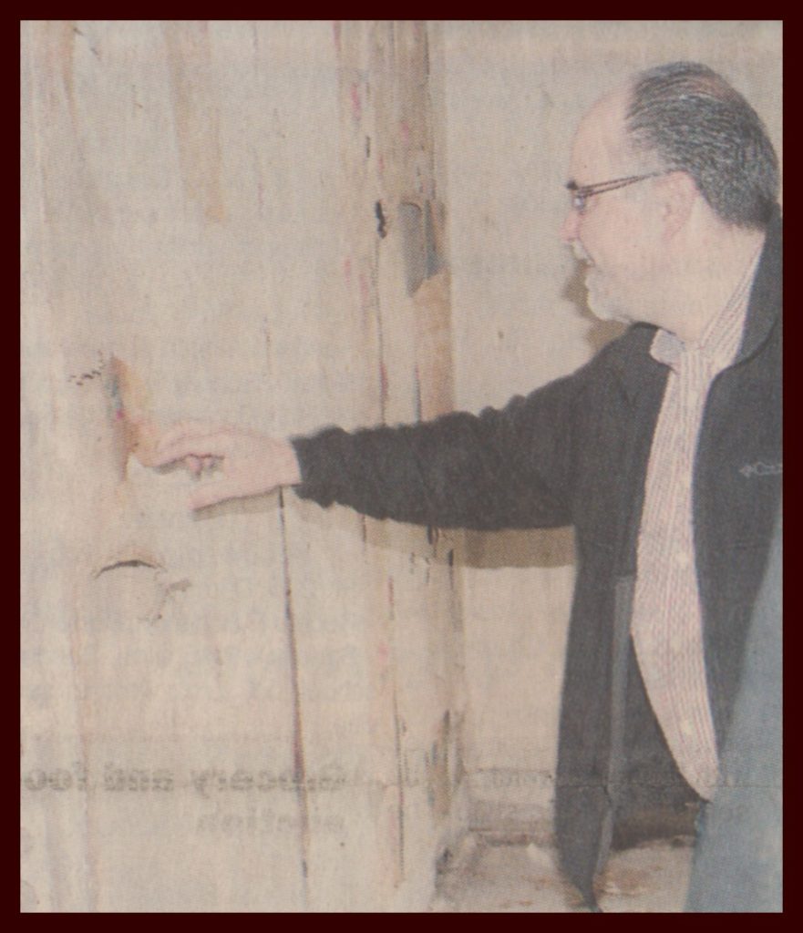 Lykens Chamber of Commerce President Kevin Jury shows the many layers of old wallpaper that still remain on the wall in one of the upstairs bedrooms.  He said there is much work to be done, but the costs would be far greater to destroy the building than to revitalize it.  Jury has been working with others in the borough for 10 years trying to secure funds to bring the plans to fruition for the hotel and the Israel Building across the street.