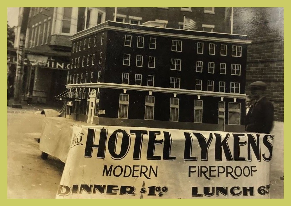 The photo shows a model of the hotel and a banner indicating that the Hotel Lykens was modern and fireproof, and offered dinners at $1.00 and lunch at 65 cents. The man standing alongside the model is not identified.