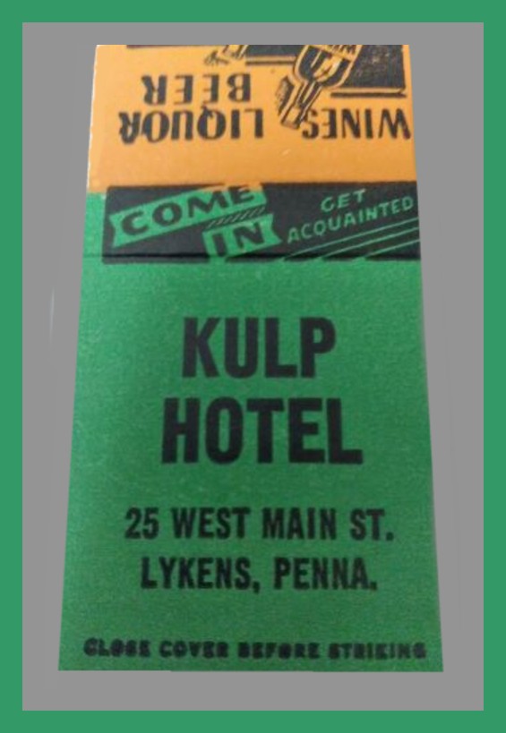 An undated advertising match book cover for the Kulp Hotel, 25 West Main Street, Lykens, Dauphin County, Pennsylvania.