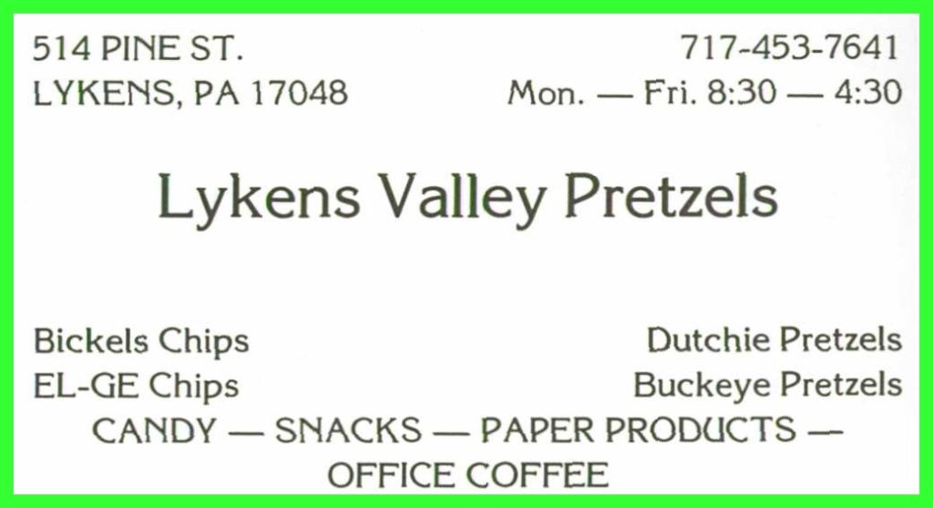 A 1987 advertisement for Lykens Valley Pretzels, 514 Pine Street, Lykens, Pennsylvania.