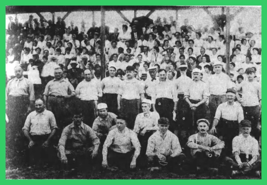 A photograph taken on July 28, 1916, at a baseball game between the manufacturers and merchants of Lykens, Dauphin County, Pennsylvania, for the benefit of the Pastime Athletic Association. It was witnessed by hundreds of spectators and was said to be one of the most interesting of the season. The manufacturers won the game by the final score of 24 to 18.