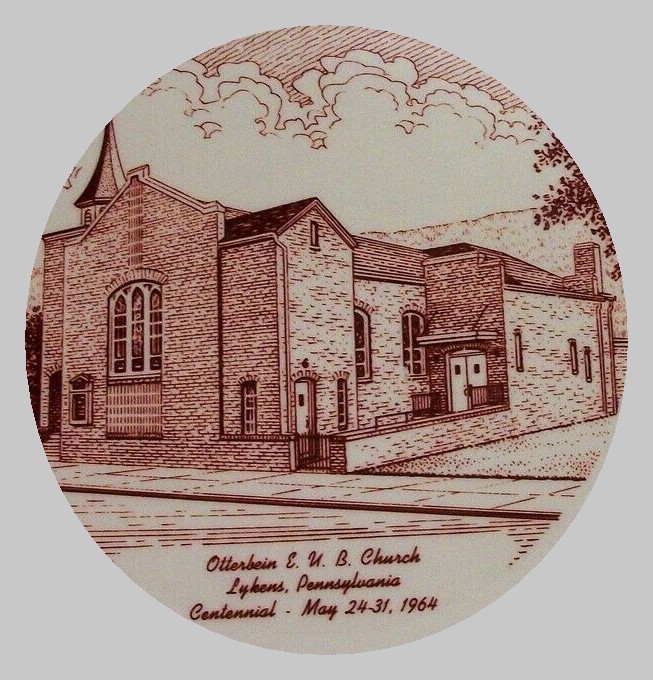 The design portion of a souvenir plate issued for the Centennial (1854-1964) of the Otterbein Evangelical United Brethren Church, Lykens, Dauphin County, Pennsylvania. The celebration took place May 24-31, 1964.