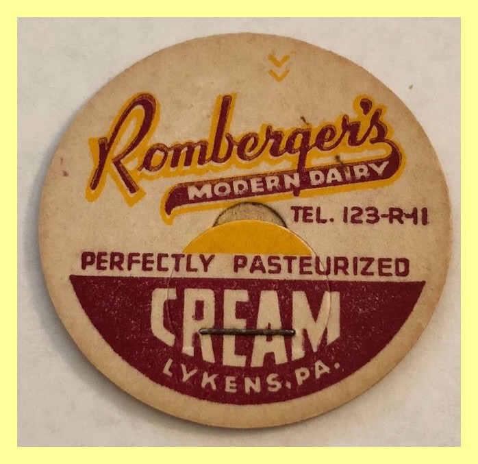 A bottle cap for “perfectly pasteurized cream” from Romberger’s Modern Dairy, Lykens, Dauphin County, Pennsylvania.