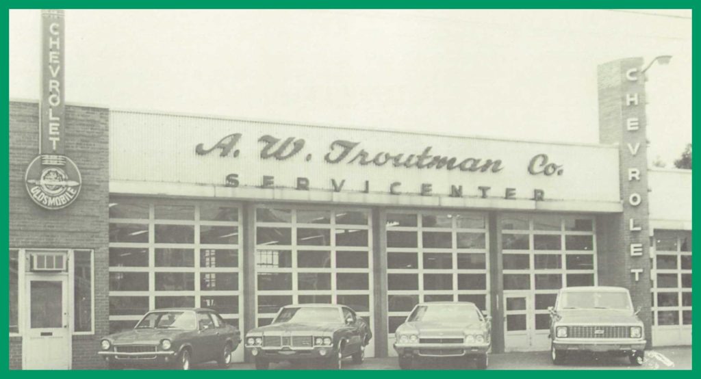 A 1972 advertising photograph for A. W. Troutman Company, Millersburg, Dauphin County, Pennsylvania, a dealer in Chevrolet vehicles.