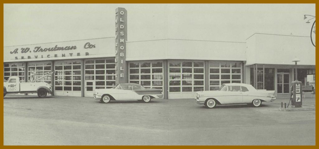 A 1958 advertising photograph for the A. W. Troutman Company, dealer in Chevrolet and Oldsmobile vehicles, Millersburg, Dauphin County, Pennsylvania.