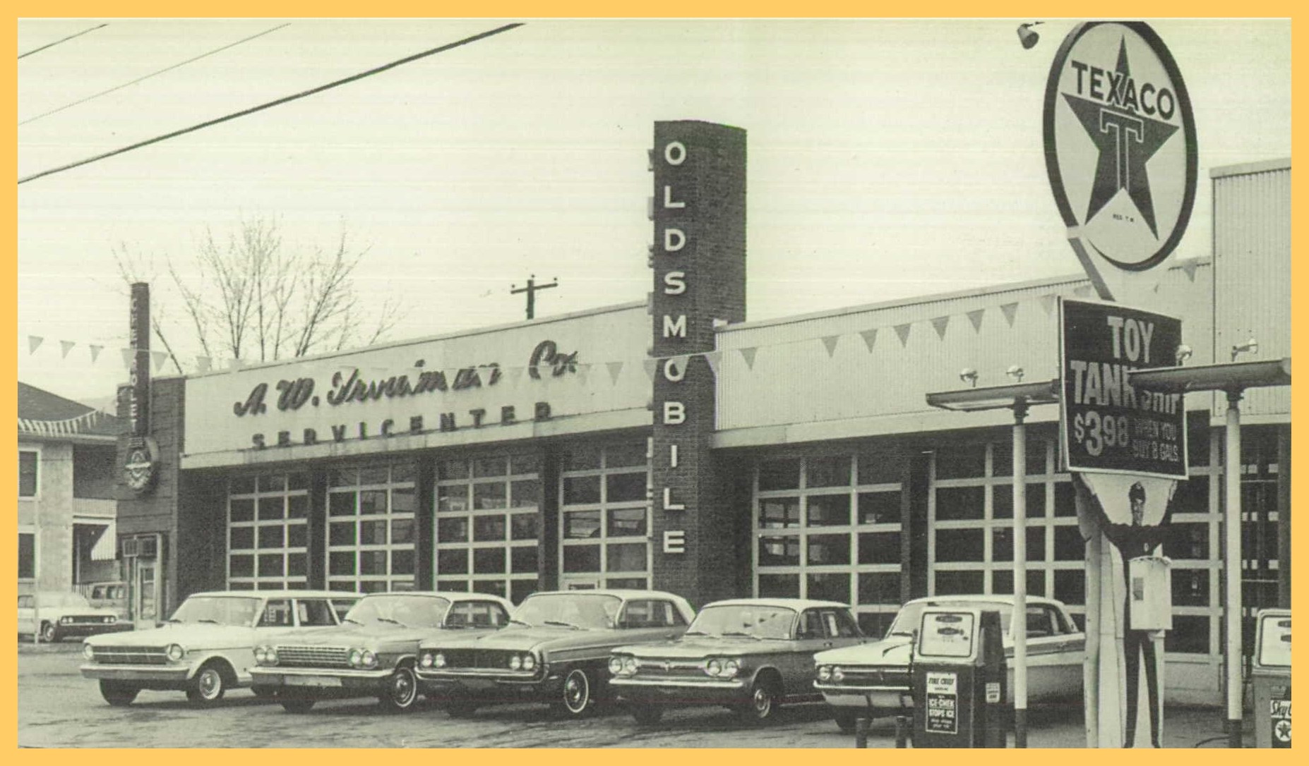 A 1962 advertising photograph for the A. W. Troutman Servicenter, Chevrolet and Oldsmobile auto dealer at Millersburg, Dauphin County, Pennsylvania.