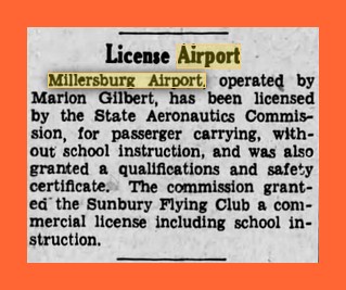 Millersburg Airport, operated by Marion Gilbert, has been licensed by the State Aeronautics Commission, for passenger carrying, without school instruction, and was also granted a qualification and safety certificate. The commission granted the Sunbury Flying Club a commercial license including school instruction.