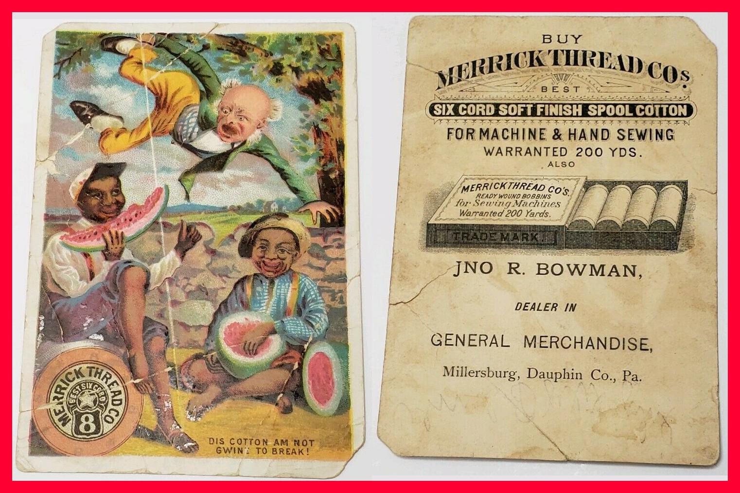 The face of the card shows a racist image of two African Americans eating watermelon and a man hovering over them. The image does not appear to have any relationship to the thread company except for the sarcastic attempt at dialect in the expression, “dis cotton am not gwin’ to break!” Cabinets or store displays as well as advertising in print media for Merrick sometimes used similar images.