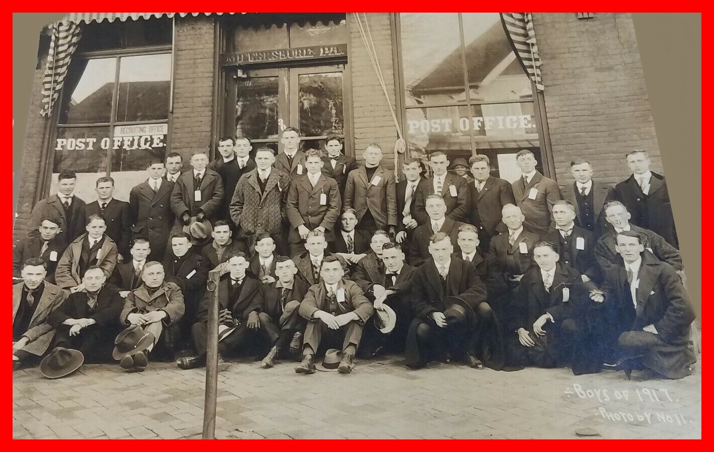 A photograph taken by Noll of the “Boys of 1917” in front of the Millersburg Post Office, Millersburg, Dauphin County, Pennsylvania. These were the draftees who were selected to go off and fight in the World War.