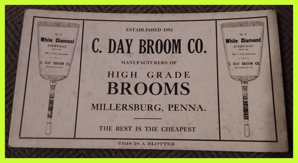 An undated advertising blotter for the C. Day Broom Company, Millersburg, Dauphin County, Pennsylvania, manufacturers of “High Grade Brooms.”