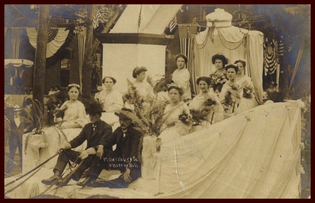 A 1907 photograph of the queen and her court float for the Millersburg Centennial Parade, Millersburg, Dauphin County, Pennsylvania. The float has just passed through one of the centennial arches.