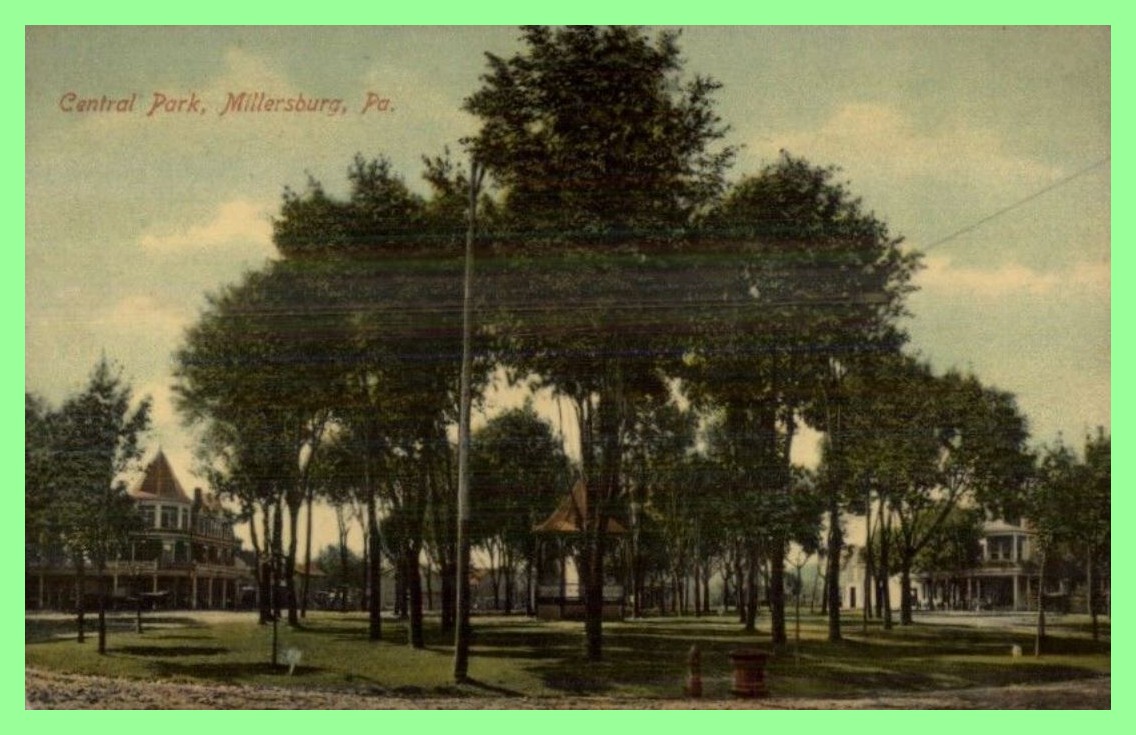 An undated post card view of the Central Park or Square of Millersburg, Dauphin County, Pennsylvania.