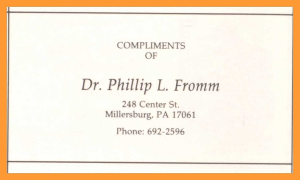A 1990 advertisement for Dr. Phillip L. Fromm, 248 Center Street, Millersburg, Dauphin County, Pennsylvania.