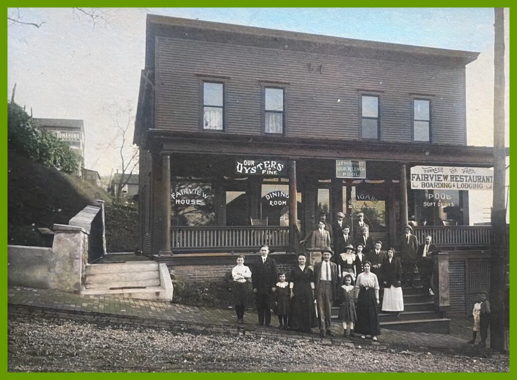 An undated, colorized photograph of the Fairview House, Center Street, Millersburg, Dauphin County, Pennsylvania. This commercial establishment had rooms for rent, a restaurant with dining room, bar, and pool hall. It also sold cigars, and as the sign stated, “Our Oysters Fine.”