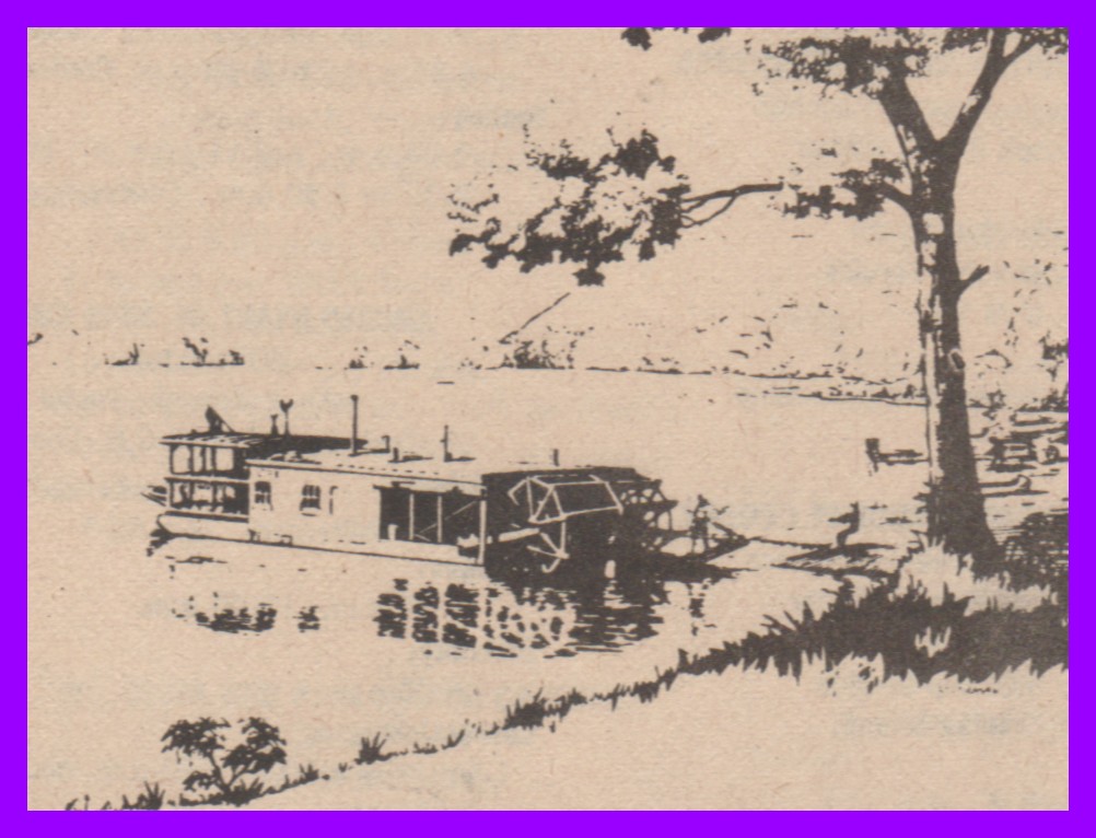 A 1983 newspaper photograph of a print showing The Falcon, a paddlewheel boat in operation on the Millersburg Ferry, Millersburg, Dauphin County, Pennsylvania. The boat is docked at the North Street Landing.