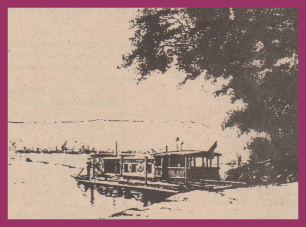 A 1983 newspaper photograph of a print showing The Roaring Bull, a paddlewheel boat in operation on the Millersburg Ferry, Millersburg, Dauphin County, Pennsylvania. The boat is docked at the Crows Landing.