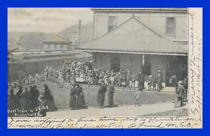 An undated post card view of the first passenger train arriving at the new Millersburg Railroad Depot, 28 April 1898, Millersburg, Dauphin County, Pennsylvania.