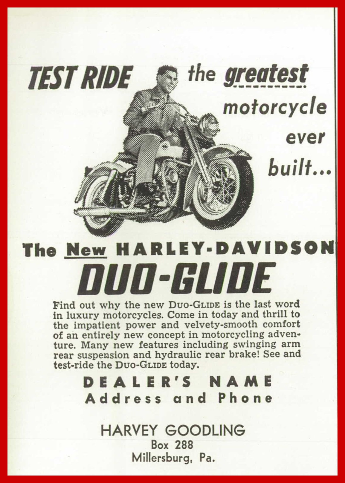 In 1958, Harvey Goodling was the official dealer in Millersburg, Dauphin County, Pennsylvania, for Harley-Davidson motorcycles. The advertisement described the Duo-Glide, a luxury motorcycle:
