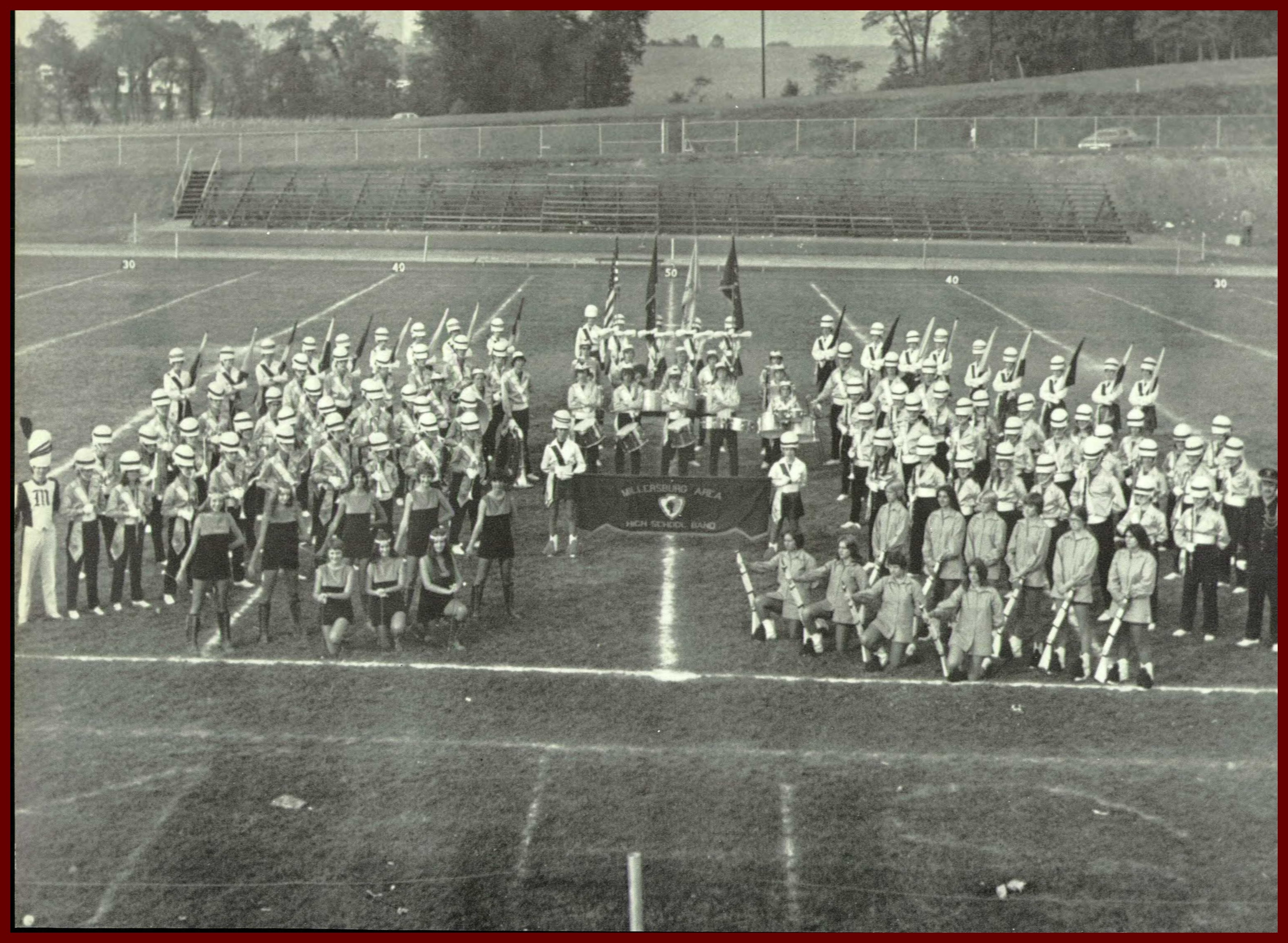 A 1975 photograph of the marching band of the Millersburg High School, Millersburg, Dauphin County, Pennsylvania.