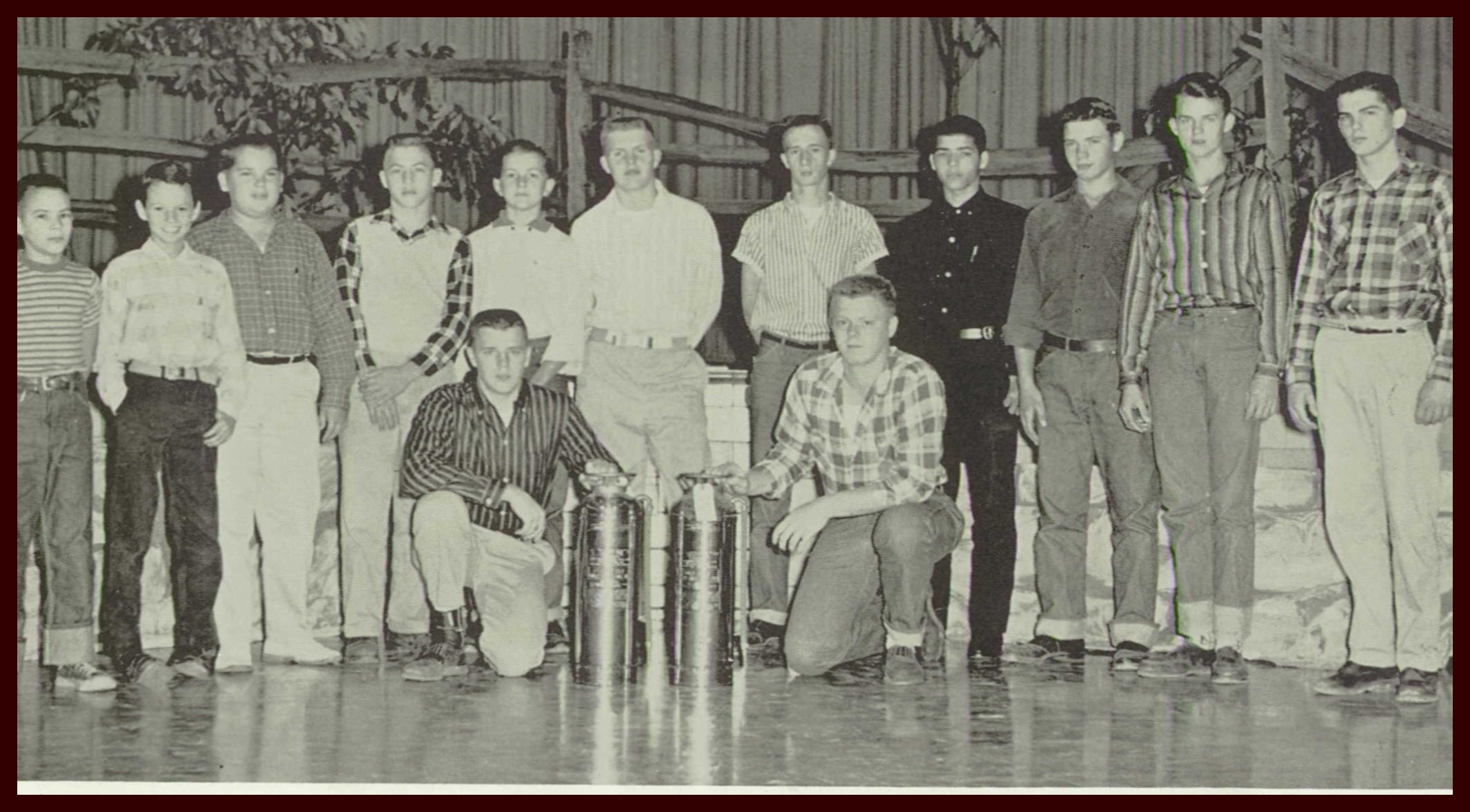 A 1958 photograph of the fire brigade of the Millersburg High School, Millersburg, Dauphin County, Pennsylvania.