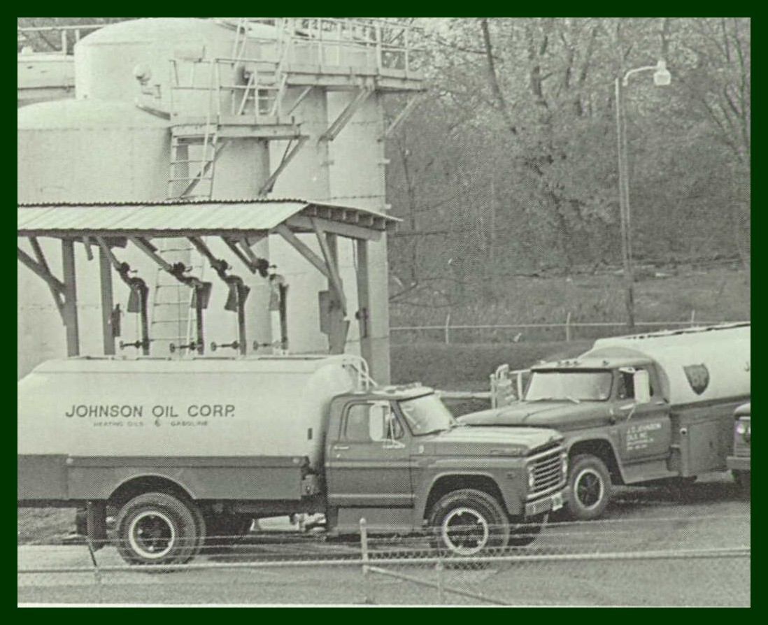 A 1976 advertising photograph for the Johnson Oil Company, 212 S. Market Street, Millersburg, Dauphin County, Pennsylvania. Pictured are two of their home delivery vehicles and supply tanks.