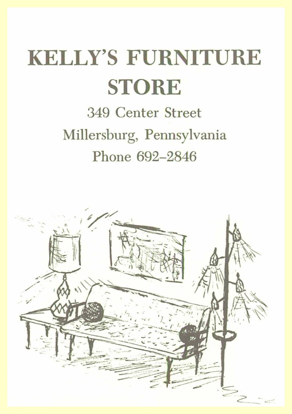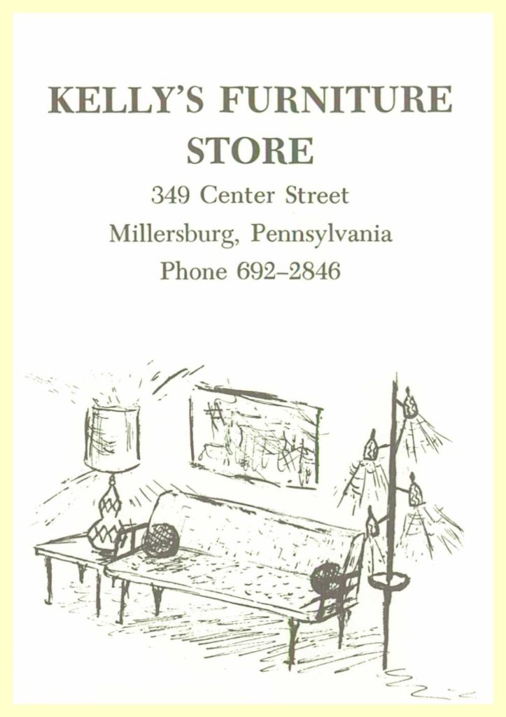 A 1969 advertisement for Kelly’s Furniture Store, 349 Center Street, Millersburg, Dauphin County, Pennsylvania.