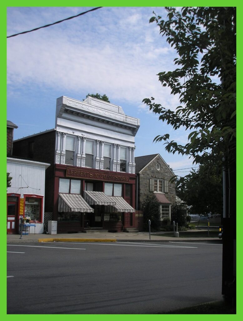 A 2008 view of the north side of Market Square Park, with a restored building housing Leppert’s 10 to $1.00 Store, Millersburg, Dauphin County, Pennsylvania.