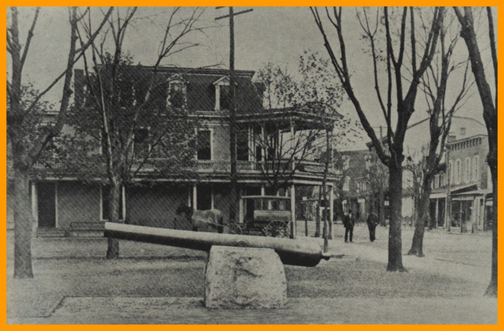 A 1907 photograph of Market Square, looking north, Millersburg, Dauphin County, Pennsylvania. The cannon features prominently in the picture.