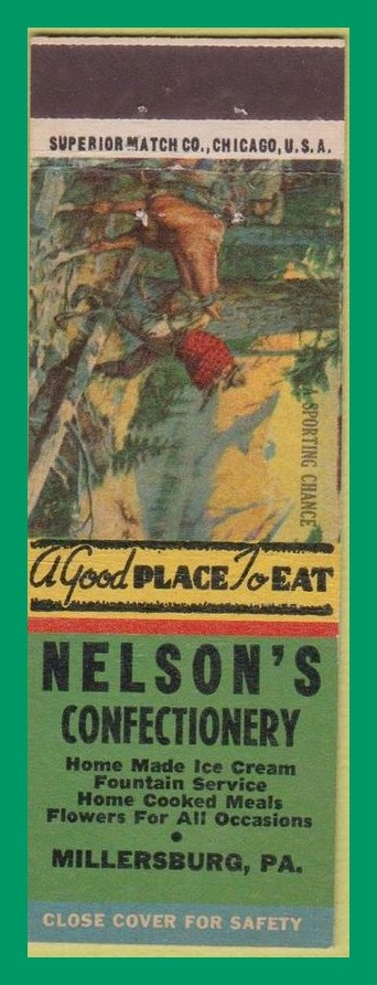 An undated matchbook cover advertising Nelson’s Confectionery, Millersburg, Dauphin County, Pennsylvania.