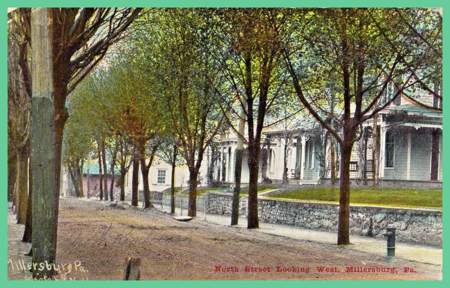 A colorized picture post card view of North Street Looking West, Millersburg, Dauphin County, Pennsylvania.